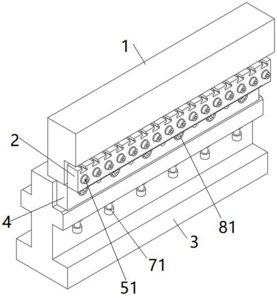 作为一种优选的实施方式,上述第一微调组件7包括多个下刀模调节螺杆71,上述安装块中竖向设有多个沿左右方向间隔分布的第三螺孔,多个上述下刀模调节螺杆71分别自下而上一一对应的贯穿多个上述第三螺孔,并与上述第三螺孔螺纹连接,上述下刀模调节螺杆71的下端设有第二锁紧螺母711,上述第二锁紧螺母711用于拧动至与上述安装块下端相抵或分离。